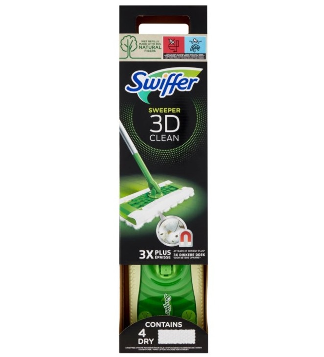 入门套件包括 1 把扫帚、2 块湿巾和 4 块干巾,与传统扫帚相比,可捕获并保留多达 3 倍的灰尘和毛发。
