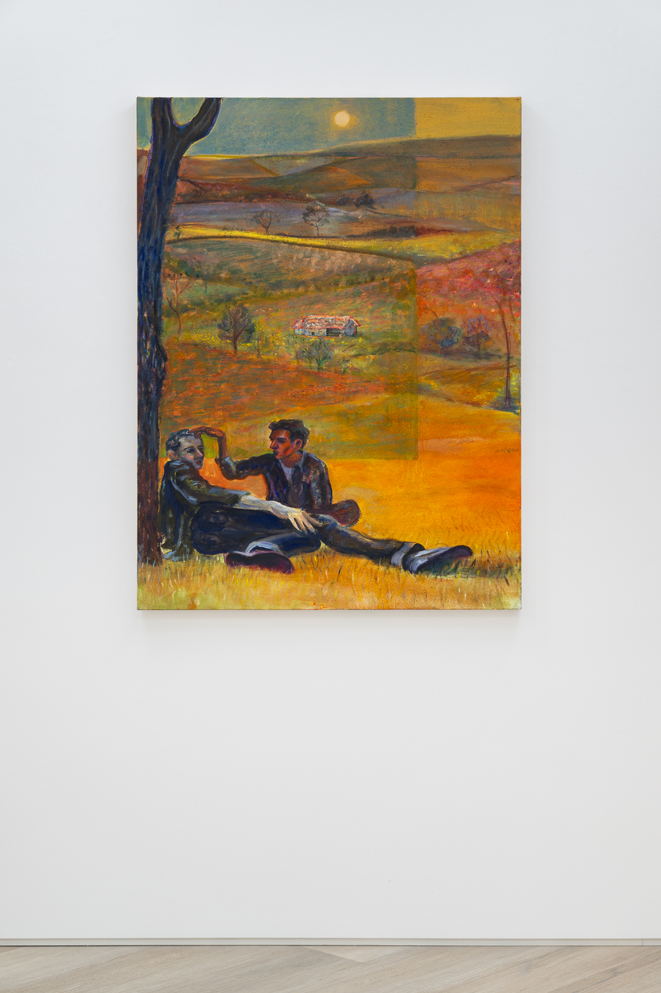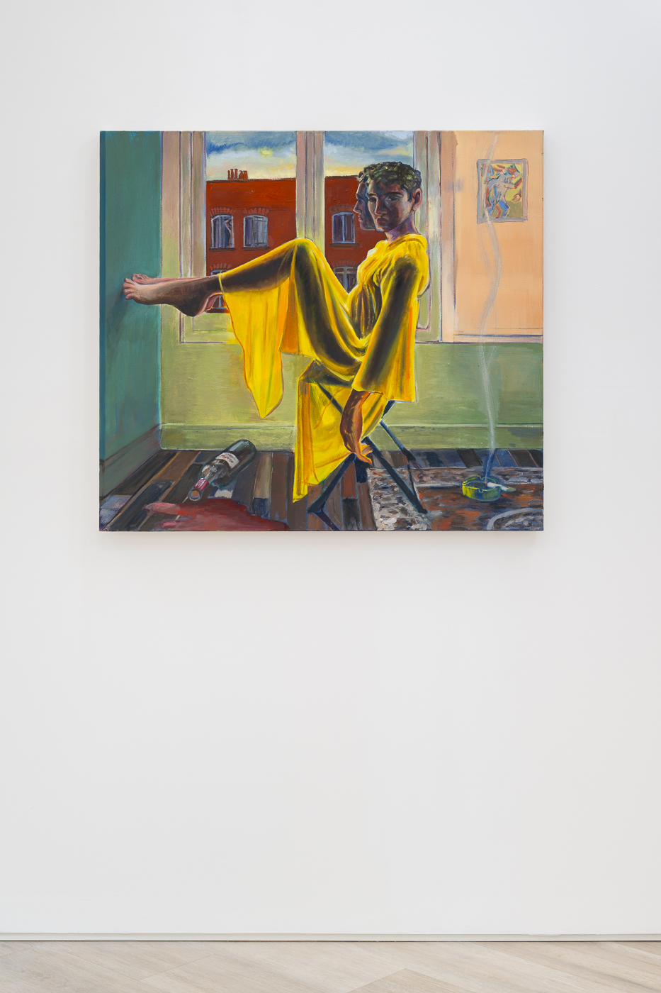 这幅作品采用油画与大理石粉,画面呈现出模糊的边界和温柔的色调,仿佛记录下夜晚结束后短暂的沉思时刻。作品以细腻的情感表达,呼应展览对亲密与自我探索主题的关注。