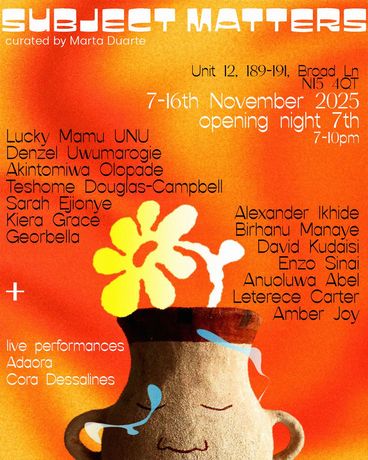 “Subject Matters”是一场聚焦非洲与加勒比裔艺术家身份和传承的群展,灵感源自英国-尼日利亚音乐人Little Simz的同名作品。展览通过绘画、摄影、装置、雕塑等多元媒介,探讨身份、移民、性别角色及艺术表达的韧性。参展艺术家包括Alexander Ikhide、Akintomiwa Olopade、Amber Joy等新锐与知名面孔,由策展人Marta Duarte精心策划。展览不仅是视觉盛宴,还融合了诗歌朗诵和现场音乐表演,展现了非洲与加勒比裔社群的多元声音和文化自信。