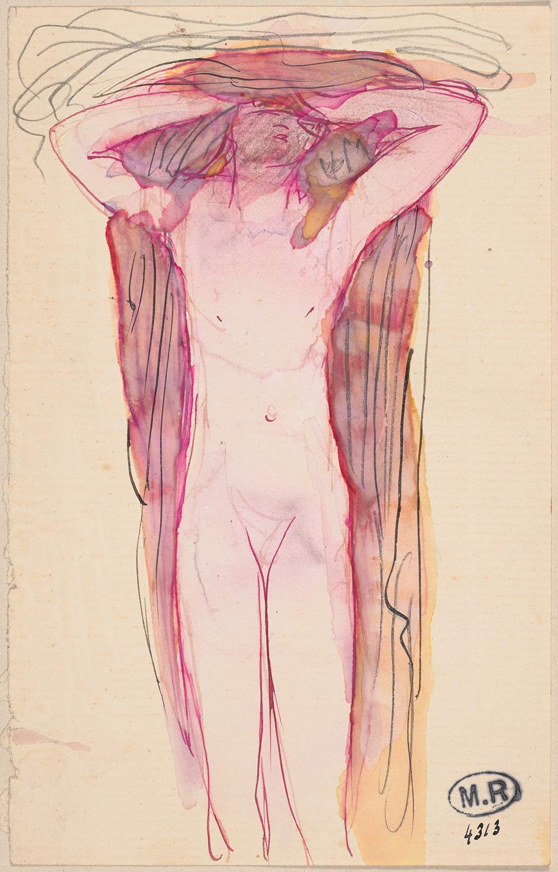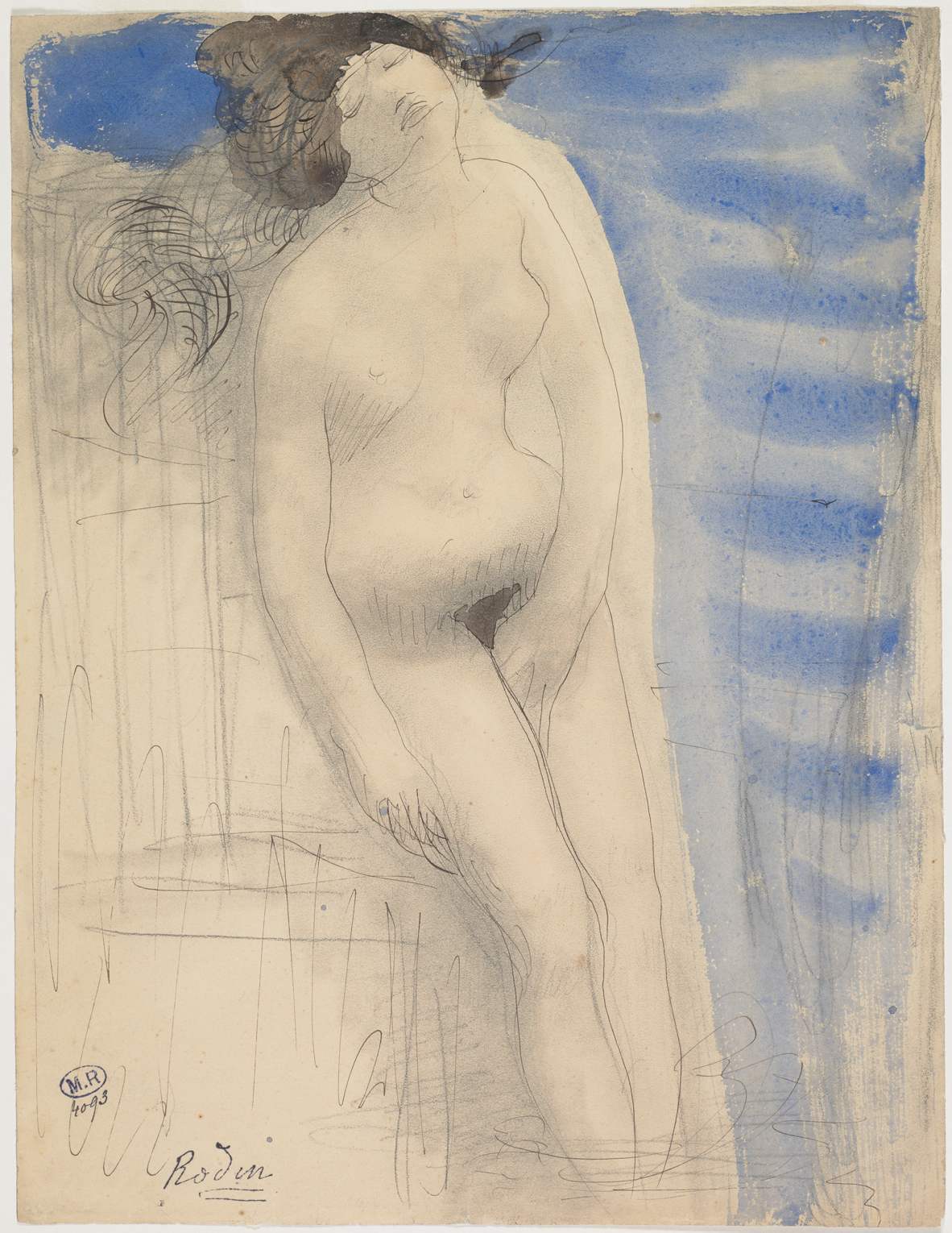 此作以流畅的线条和柔和的色彩,表现了女性身体的优雅与力量。罗丹通过素描展现了对人体美的敏锐捕捉,既有古典神话的意蕴,也体现了他对现代艺术表现力的探索。