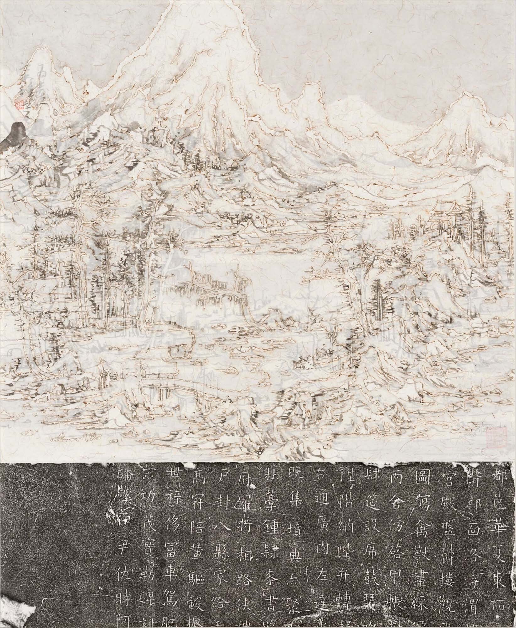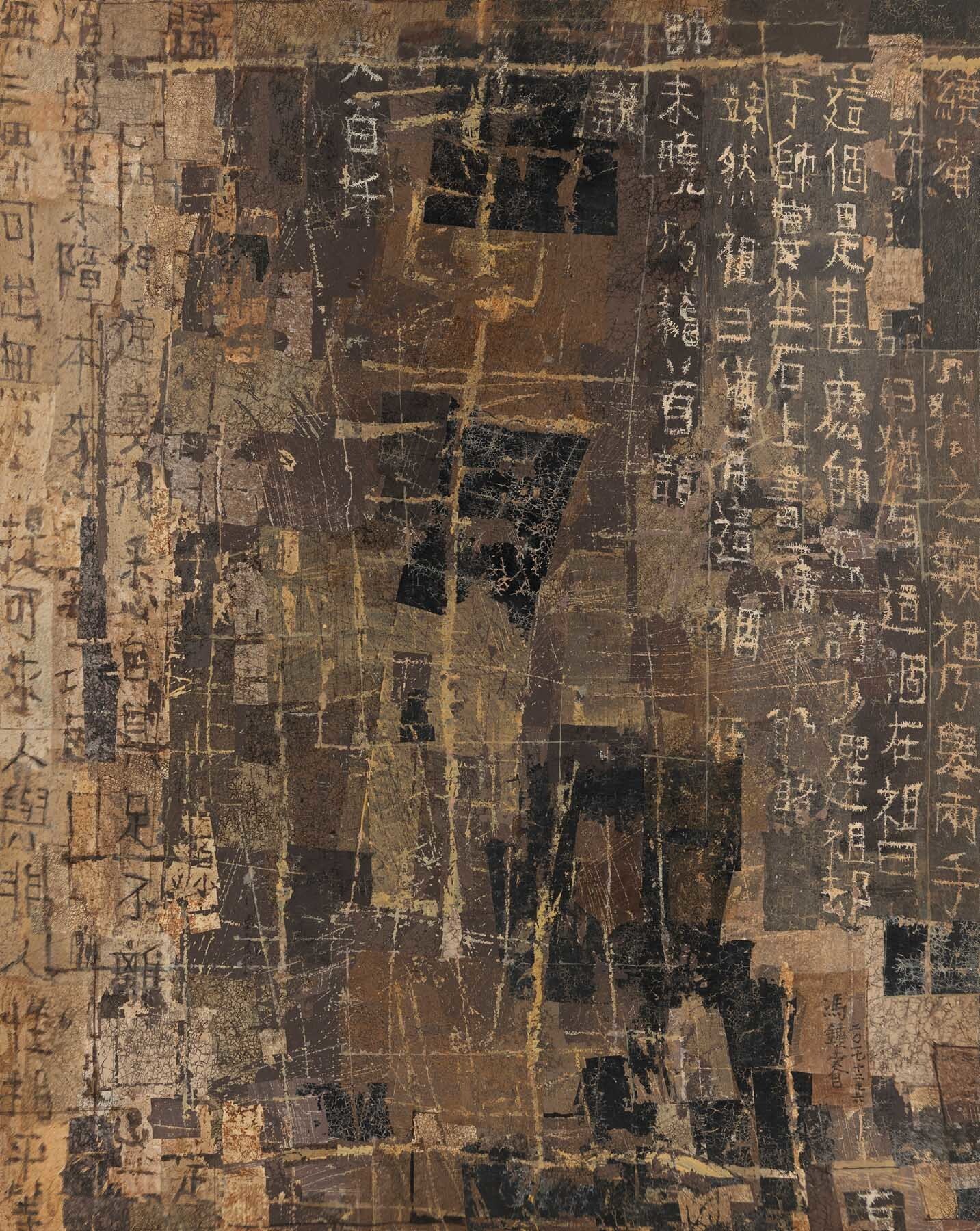 王天德以“烫灼”技法创作,将宣纸水墨画与灼烧镂空相结合,并引入古碑帖拓印。作品通过物理痕迹与历史印记的叠加,深刻诠释金石学“痕迹”的当代表达,极具实验性和视觉冲击力。