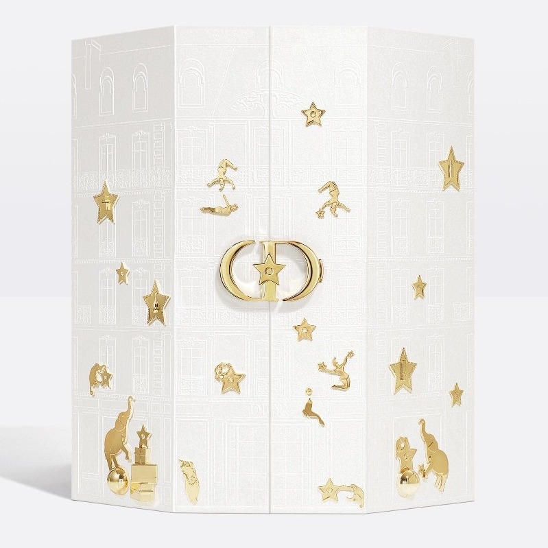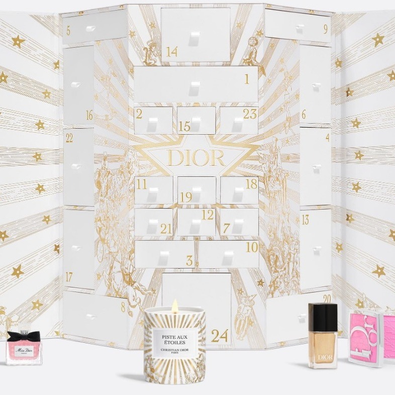 里面藏有24款Dior的迷你精品和标志性产品,香水样本、口红唇彩、指甲油、睫毛膏、护肤品等,还有一支“星光烛台”加上三个装饰纸挂件,整体既有节日装修美学,也实实在在能用到Dior的经典单品。