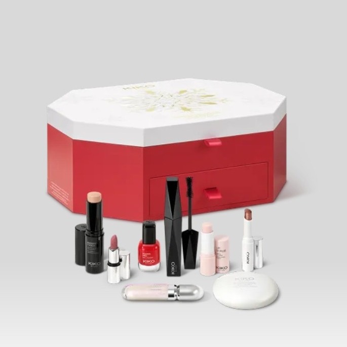 KIKO 的圣诞日历今年延续了活泼可爱的包装风格,每一格都像小宝盒,等着你去发现彩妆的小秘密。共计24款美妆明星产品,畅销产品也在里面!还能拆出圣诞限定哦!涵盖彩妆、护肤、工具,甚至还有一款固体香氛。