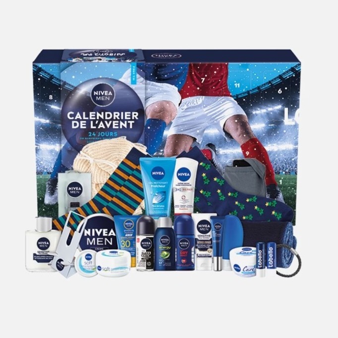 妮维雅今年有两款日历,经典款Calendrier de l'Avent更偏向通用基础护肤,里面有含透明质酸的CELLULAR EXPERT FILLER精华、带SPF15的24小时保湿日霜,还有眼唇卸妆液、敏感肌micellar水等刚需品,配件连面部按摩滚轴、美妆蛋、化妆刷清洁工具都配齐,日常护肤党或学生党用着超顺手;而另一款精准贴合男士“高效多用途”需求,须面二合一凝胶、敏感肌须后乳、抗老眼霜都是专为男性肤质设计,配件还包含男士手环、管状头巾、手机臂包,送男友或爸爸完全不踩雷。
