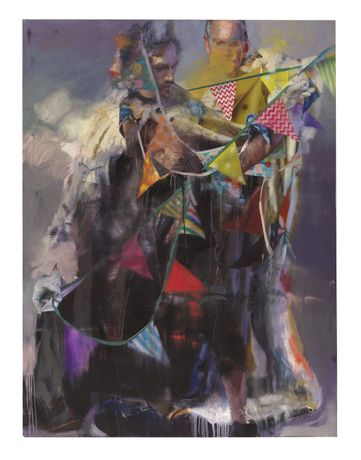 这幅油画与喷漆作品展现了Harrington标志性的历史与当代融合风格。画面中的人物身披象征权威的披风,背景则以虚化的节庆彩旗点缀,象征着权力仪式的脆弱与表演性。作品通过对服饰与符号的重新演绎,呼应展览主题“Pallium”,揭示历史权力的空洞与持续影响。