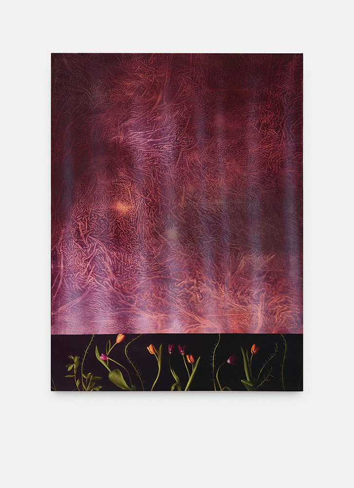 大尺幅油画,色彩丰富、层次分明。Fretwell以梦境般的构图,将静物元素融入抽象与现实之间,展现其对“观看”与“被观看”关系的深度探索。