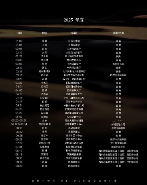 巴黎的古典乐迷们,2025年11月11日郎朗在巴黎爱乐音乐厅的这场音乐会真的太让人羡慕了!作为他全球巡演的重要一站,门票早就被一抢而空,毕竟能在顶级声场里听他弹琴实在难得。这季巡演他准备了超多重磅曲目,既有贝多芬、舒曼的经典独奏作品,说不定还会带来新专辑《钢琴书 2》里《黑神话:悟空》主题曲这类跨界改编,之前他在巴黎圣母院开幕音乐会和慈善音乐会上的演出都让人印象深刻,这次现场大概率又会贡献让人回味的名场面,没抢到票的可以蹲一波后续有没有捡漏的机会啦!