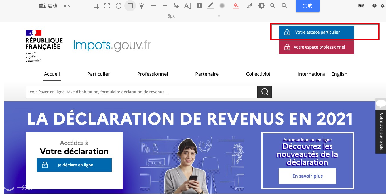在税务局官网登陆后,只需点击网页右上角的Accéder à la déclaration en ligne就可以直达报税页面了。