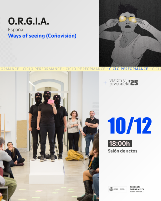 《Ways of seeing (Coñovisión)》是一场由O.R.G.I.A.艺术团体在马德里提森-博内米萨国家博物馆(Museo Nacional Thyssen-Bornemisza)特别策划的现场表演。此次表演以“观看方式”为核心,融合了女性主义视角,对“视觉”、“再现”、“身体”与“视觉中心主义”进行深刻反思。O.R.G.I.A.以其跨媒介、多层次的艺术语言著称,作品常常挑战传统观看习惯,强调身体与社会结构之间的互动。本次项目结合了录像、雕塑、讲演式表演和行为艺术,借助博物馆馆藏女性裸体作品,展开一场关于女性身体与观看权力的当代表达。