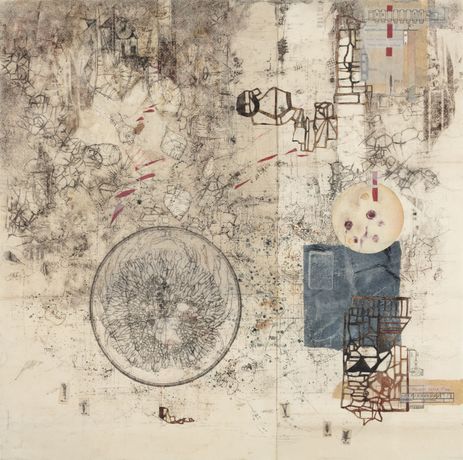 采用凹版油墨、铅笔和拼贴于实验室旧纸上,展现了日常材料在新语境下的诗意重组。作品细腻地捕捉了微观世界的脆弱与偶然,体现艺术家对“即时性”与“被忽略空间”的敏锐关注。