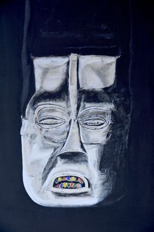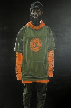 92×73厘米的丙烯画作,延续雕塑《Hood Boy》的主题,画面以深黑背景突出人物,象征力量、反叛与美感。