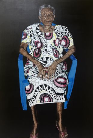 同样为210×140厘米的丙烯肖像,灵感源自艺术家家族记忆与非洲侨民身份,画面以深邃色调和强烈情感,致敬长辈与文化传承,赋予普通人物以崇高地位。