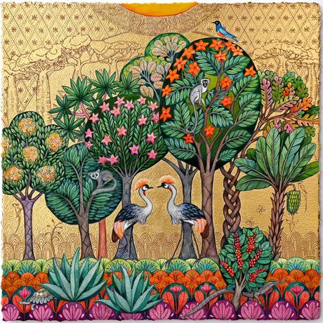 水彩与金箔,34 x 34 cm。以非洲自然景观为灵感,作品中动物与天空交织,展现大地的辽阔与生命的多样,金箔细节增添神圣感,呼应展览对自然与文化的致敬。