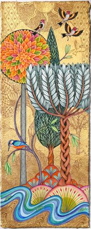 水彩与金箔,21 x 51 cm。画面通过细腻的树木与动物形象,象征探索与成长,金箔的光泽赋予作品神秘的启示感,体现艺术家对未知世界的诗意追问。