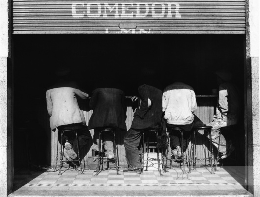这幅作品以墨西哥城街头为背景,捕捉了普通人的瞬间姿态,展现了布拉沃对社会现实的敏锐观察和人文关怀。画面中人物的动作与环境形成诗意的对话,是其纪实与象征主义风格的代表。