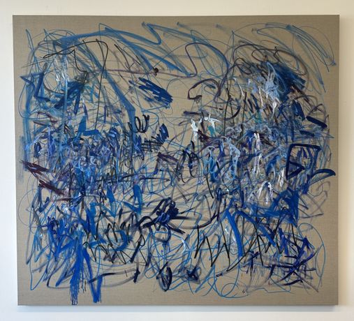 这件作品以厚重的肌理和层层叠加的色彩,表现语言与情感之间的模糊地带。画面中抽象的线条与斑驳的色块交错,仿佛在诉说那些难以言表的内心体验,完美契合展览“界限”的主题。
