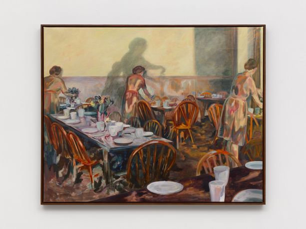 这幅作品灵感来源于英国Askham Grange女子监狱托儿所的档案照片,描绘了工作人员为孩子们精心布置餐桌的场景。画面通过花卉、杯盘等细节,探讨了照料与约束、日常劳动的循环性,呼应展览对边缘与中心的关注。