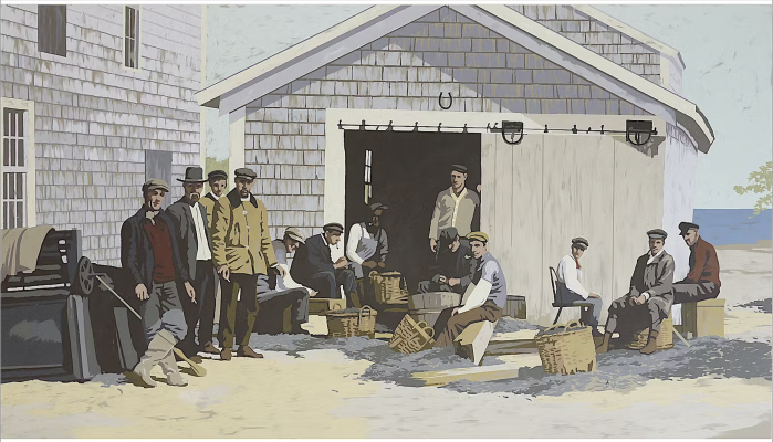 这组作品以Provincetown为灵感,结合了海洋传说、美国东海岸的历史遗迹与个人回忆。Benedict用水粉在木板或纸上创作,画面平面化且富有叙事性,仿佛一页页插画日记。画中常见19世纪风格的船只、神秘的海岸建筑、神话生物和历史人物,展现了艺术家对美国文化根源的探索。