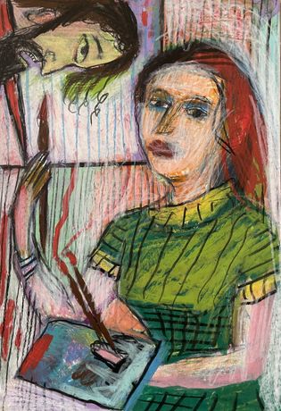 Collings以历史女画家Artemisia Gentileschi为灵感,重现其著名的斩首主题,同时融入现代视角和自嘲,展现艺术家对历史与现实的双重思考。