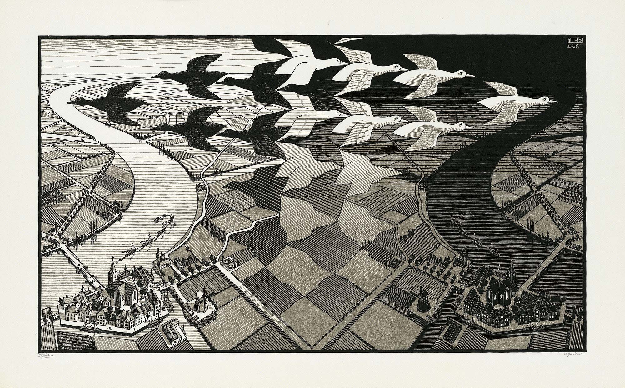 这件木刻作品以黑白两色的鸟群为主题,展现了昼夜交替的无缝过渡。画面中,田野与鸟群相互转化,象征着对称、无限和变形,是Escher探索空间与时间连续性的代表之作。