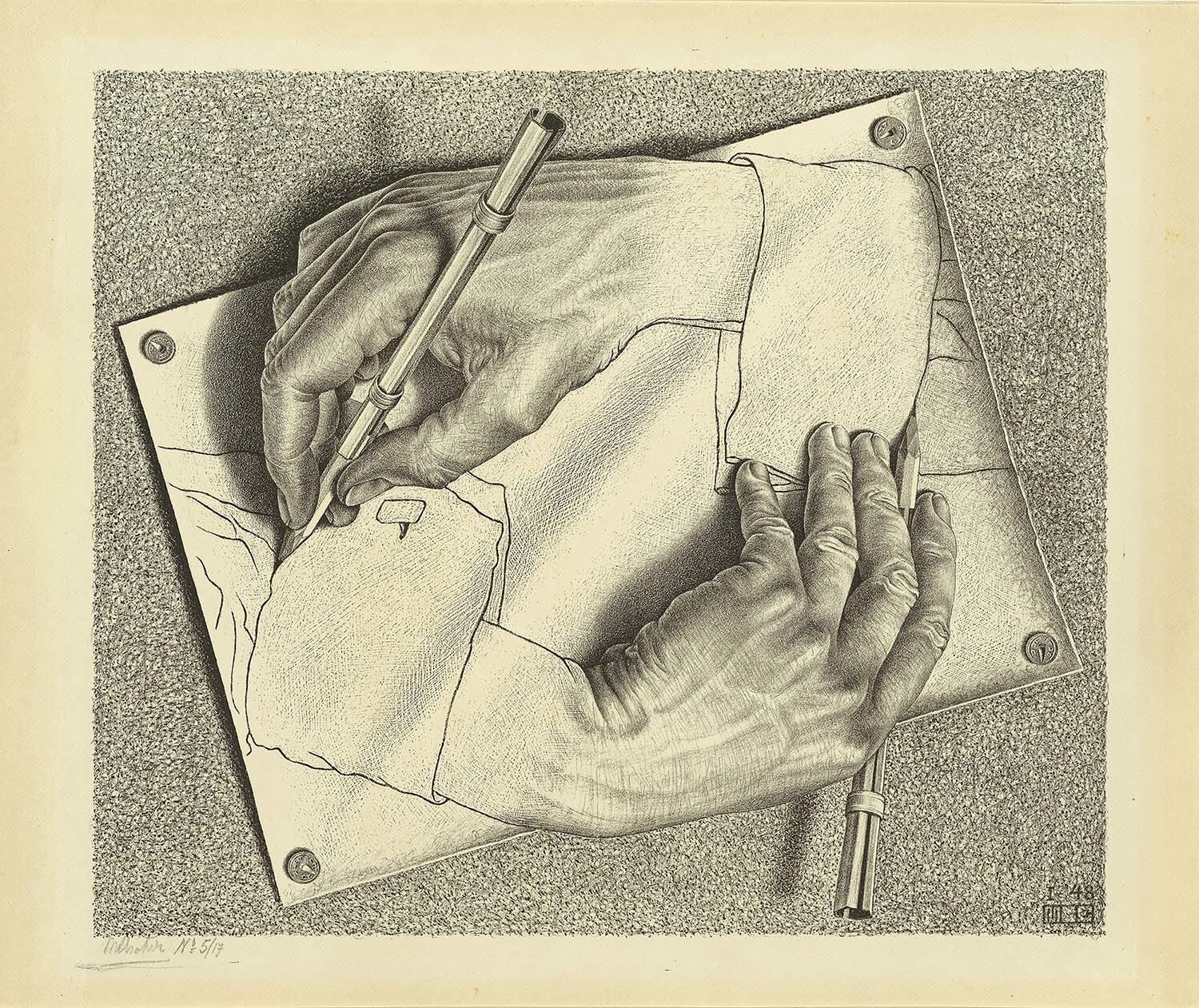这幅石版画中,两只手互相绘制对方,形成自指的无限循环。作品以其哲学意味和视觉奇观,成为Escher最具代表性的“悖论”主题之一,探讨了创作与被创作、二维与三维的界限。