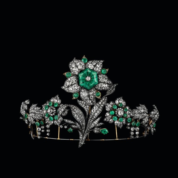 由Marie-Étienne Nitot(可能)设计,镶嵌祖母绿、钻石、黄金与白银。这套珠宝见证了拿破仑时代的皇室联姻与欧洲权力格局的变迁,是珠宝与历史交织的绝佳实例。