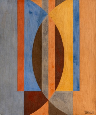这幅技法混合的布面作品(55 x 46 cm)是Virgilio几何抽象风格的代表。画面以简洁的几何形状和冷静的色彩构成,体现了他受立体主义和欧洲现代主义影响的艺术探索。作品展现了他在战后流亡期间对形式与结构的极致追求,与展览主题“几何先锋”紧密呼应。