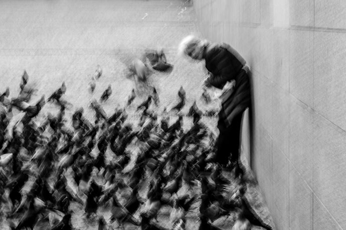 该作品捕捉了伦敦街头一位与鸽子为伴的老妇人,展现了城市生活的温情瞬间,也映射出艺术家在异乡寻找归属感的细腻情感。
