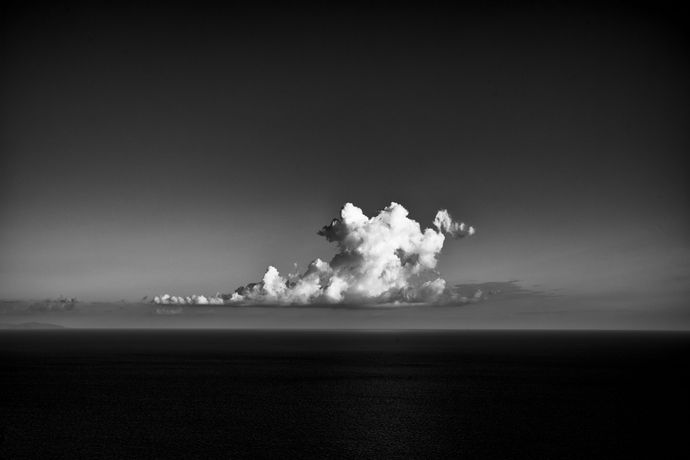 这幅作品以黑白影调展现了跨越地域与文化的旅程,象征着艺术家离乡背井、踏上新生活的勇气与未知。画面中流动的海面和远方的身影,呼应了展览主题“西游记”中的迁徙与探索。