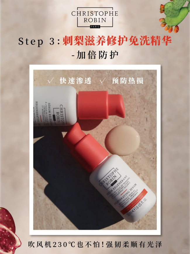 Step3️⃣:刺梨滋养修护免洗精华-加倍防护 一滴一抹,轻盈质地快速渗透、不油腻 洗护完拧干水分后涂抹,有效防止吹风机热损伤 助力发丝强韧有弹性,柔顺有光泽