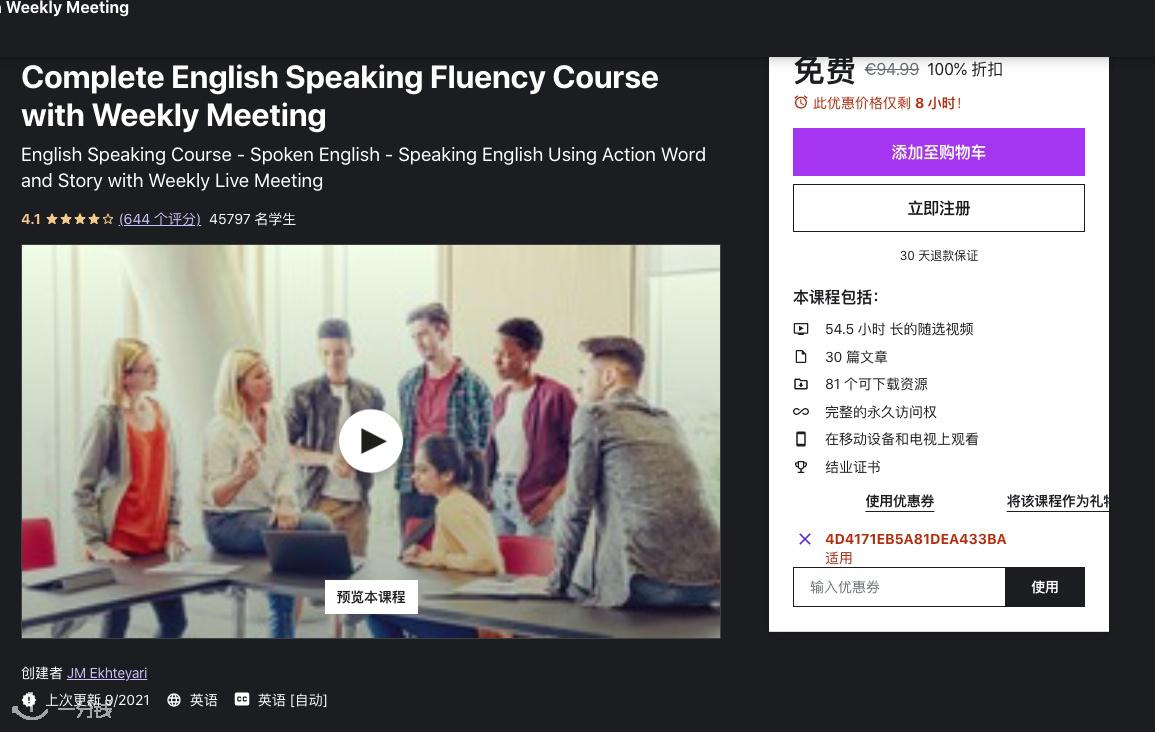 Udemy上价值90多欧的英文小课堂(Complete English Speaking Fluency Course with Weekly Meeting)免费啦!