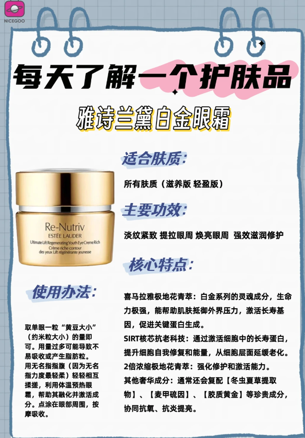 ✅ 正确用法: 1️⃣取米粒大小的眼霜指腹,分别点涂在眼下方,眼外角,眼睑上方 2️⃣先从外眼角到眼下,再到眼睑上方,由外向内点涂至吸收 ⚠️如您选择的是滋润版,使用时务必先乳化至半透明状态再使用哦~