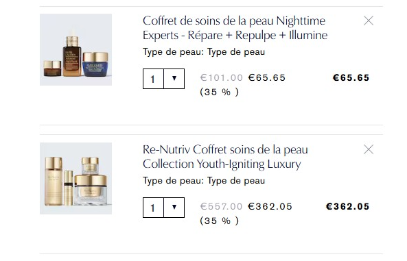 含:黑钻眼精华5ml(78€)、黑钻面霜7ml(75€)、白金面霜7ml(57€)、黑钻精华5ml(54€)、线雕精华7ml(29€)、小棕瓶精华7ml(25€)、智妍眼霜3ml(18€)、智妍面霜5ml(15€)、原生液15ml(11€)等!