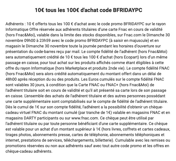 FNAC 黑五1日闪促, 计算机类产品专区 >> 每满100€返10€相当于全场9折。折扣码 BFRIDAYPC ,