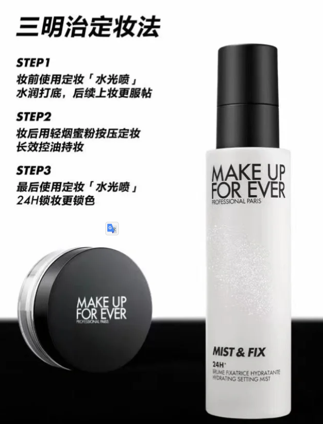 水润打底 妆前使用【定妆「水光喷」】,内涵透明质酸成分,一喷24H保湿,后续上妆服帖不卡粉