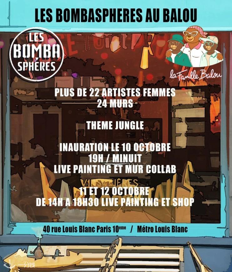今年秋天,巴黎第十区的 Balou 酒吧将变身为街头艺术的炫彩舞台!来自 Bombasphères 团体的 22 位女性艺术家将在 10 月 10 日至 12 日限时三天内,现场创作 24 面独特壁画。开幕夜有特别表演,周末还有多位艺术家轮番上阵,免费开放,适合热爱城市艺术、喜欢新鲜体验的你。无论是街头艺术粉丝,还是想感受巴黎创意氛围的朋友,都不容错过!