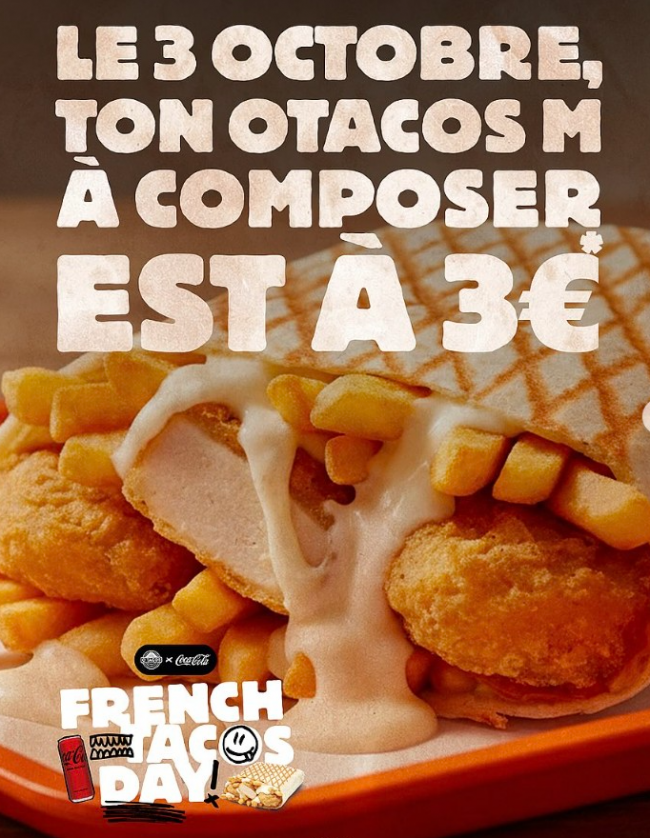 French Tacos Day 是 O’Tacos 首次发起的“法式塔可节”,将于2025年10月3日(周五)在巴黎多家门店同步举行。当天,所有参与门店的 M 号塔可仅售3欧元,并且不限购买数量!无需预约,现场还有特别氛围和互动,适合所有街头美食爱好者和想要尝鲜的朋友。无论你是塔可控还是想和朋友来一场轻松的美食聚会,这一天都值得加入!