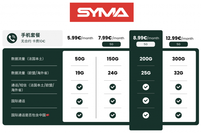 【马上有钱】SYMA超值套餐来袭🎉8.99€享200G!5G信号+欧盟25G流量📶还能免费打中国电话!