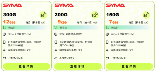 SYMA是一家成立于2008年的法国虚拟移动网络运营商,现在隶属于Altice France(也是 SFR 的母公司),因此网络覆盖和稳定性与SFR基本一致!就靠谱两字没话说!👍🏻