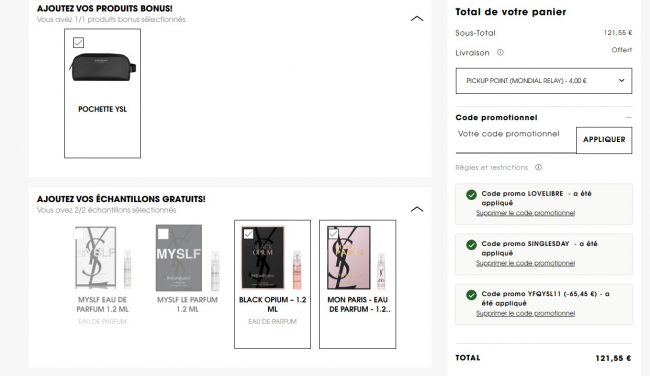 2.输入独家折扣码:YFQYSL11,折后满70€赠3件码:SINGLESDAY,买自由之水系列送香水盒子码:LOVELIBRE